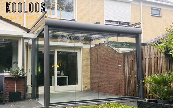 Kooloos Zon & Huis maakt de tuinkamer volledig op maat en in ieder gewenste opstelling. Het is een glazen ‘all-weather’ overkapping, met of zonder geïntegreerde zonwering. De keuze is aan u. Geïntegreerde dakzonwering, bovenliggend of onderliggend, werkt met een sterke elektrische Somfy motor en beschermt u tegen de warmte en schadelijke UV-straling. Extra opties voor nog meer gebruiksplezier.